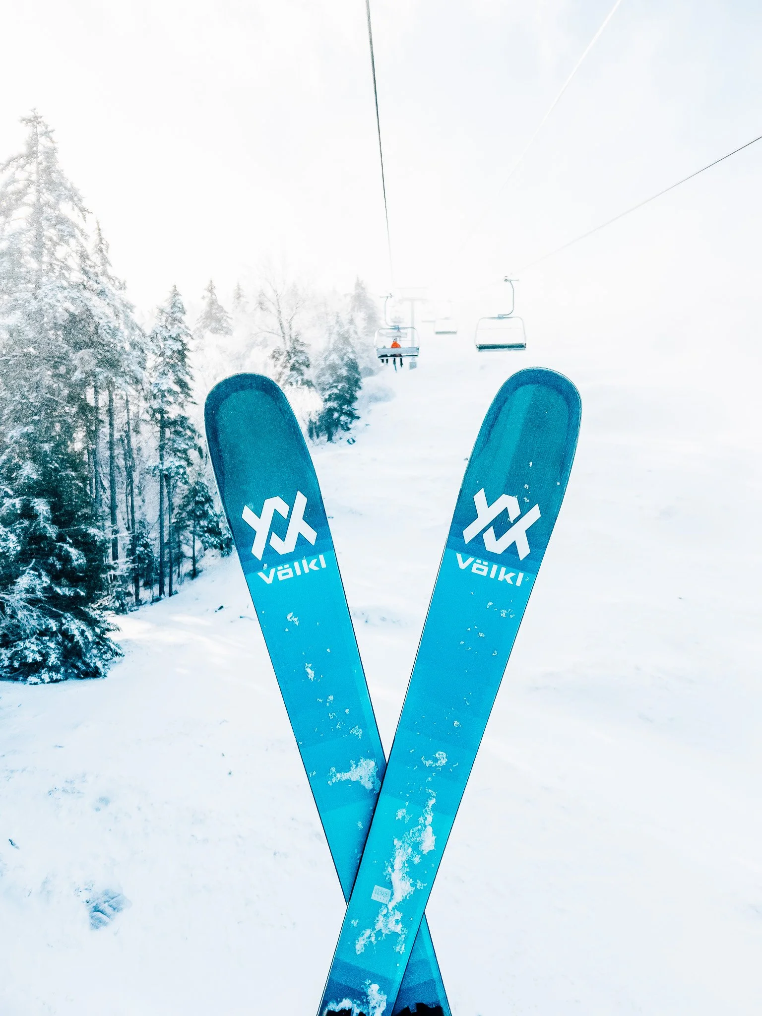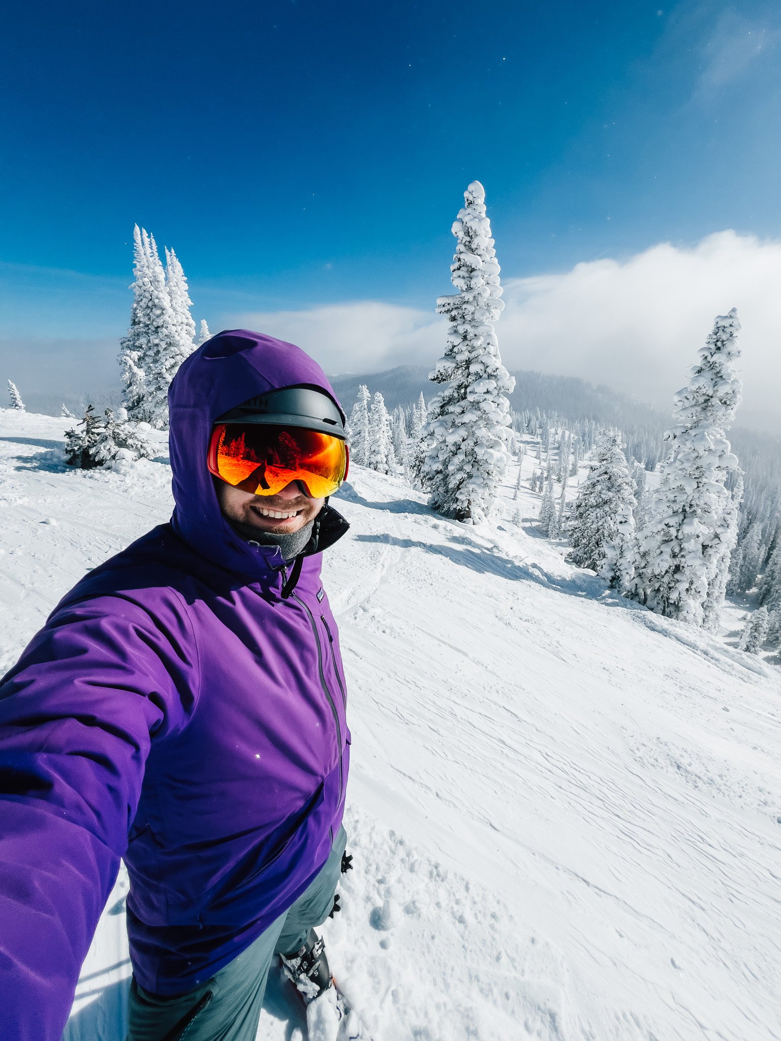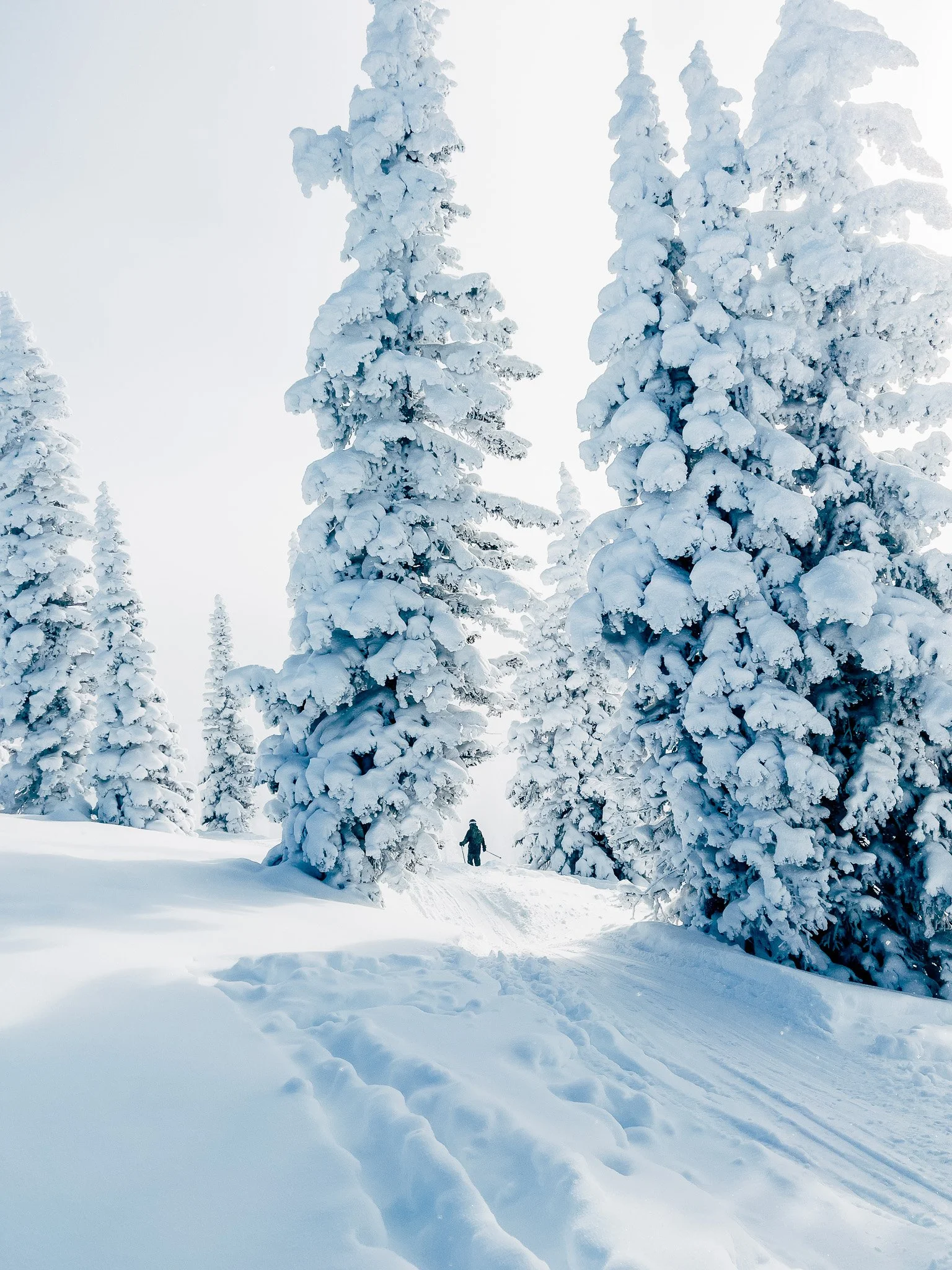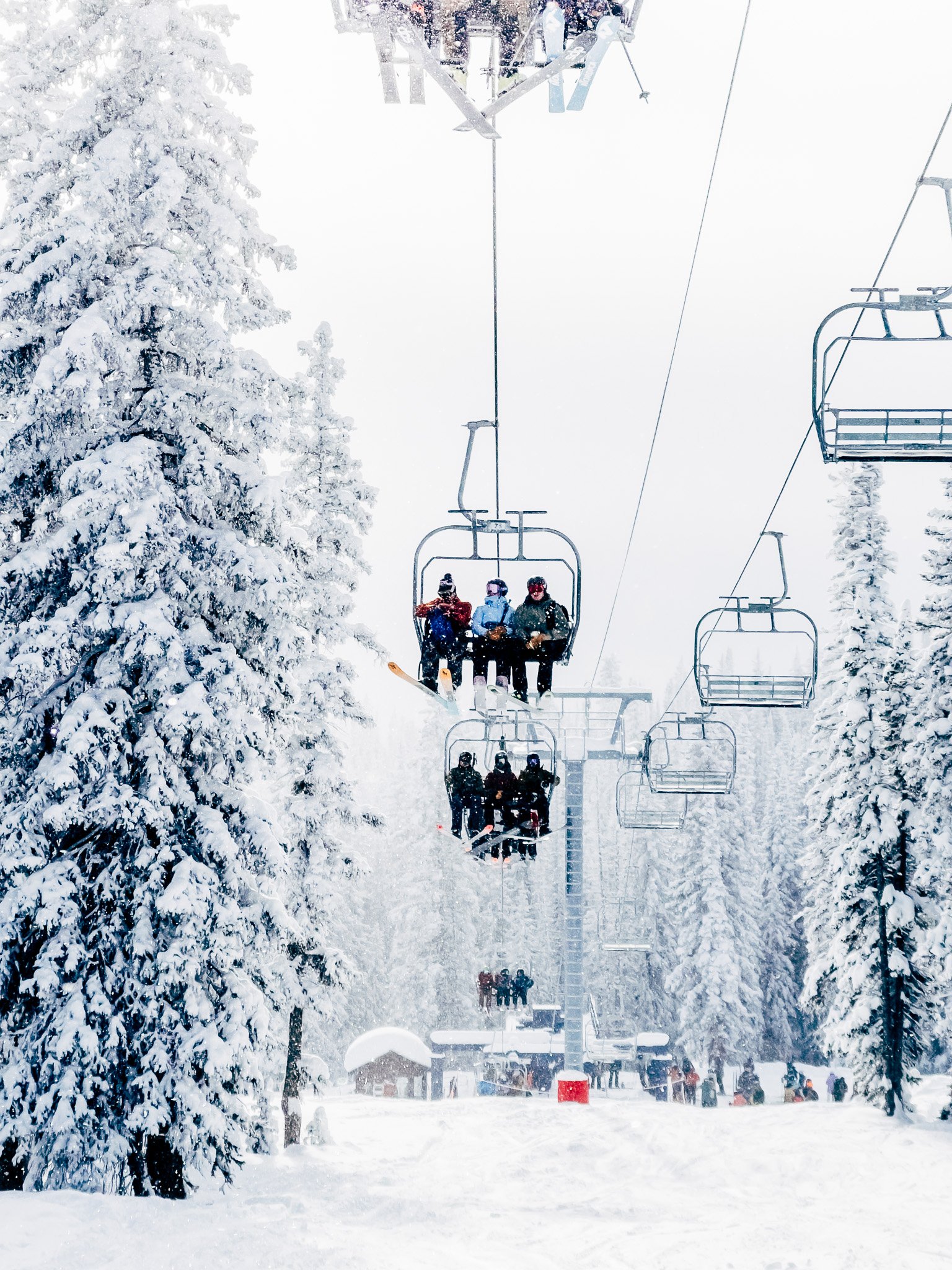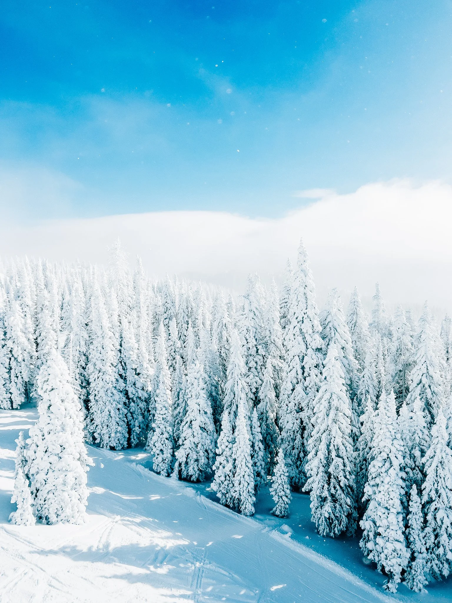 As the storm cleared, I stood on the summit and looked back toward the forested hills behind the resort. Pine trees coated in fresh snow, flakes swirling through the air, rising and falling with the wind. The sun filtered through just enough to make everything sparkle. It was pure magic.